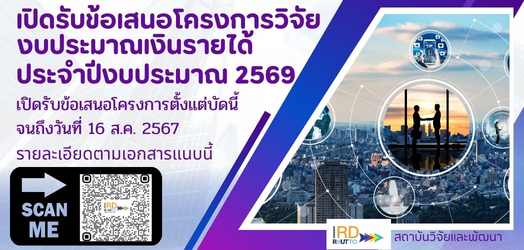 สถาบันวิจัยและพัฒนา เปิดรับข้อเสนอโครงการวิจัยงบประมาณเงินรายได้ ประจำปี 2569 เพื่อผ่านกระบวนการคัดกรองคุณภาพงานวิจัยจากผู้ทรงคุณวุฒิภายนอก โดยยื่นข้อเสนอโครงการวิจัยผ่านระบบ Google form ตั้งแต่บัดนี้จนถึง วันที่ 16 สิงหาคม 2567