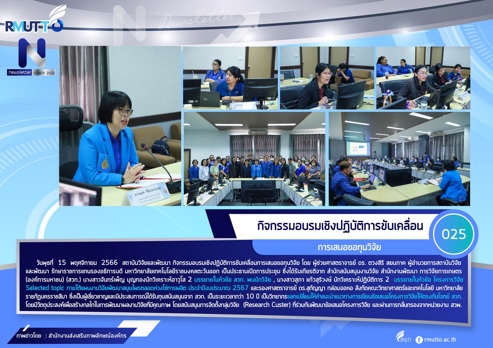 เมื่อวันพุธที่ 15 พฤศจิกายน 2566 สถาบันวิจัยและพัฒนา ได้จัดกิจกรรมอบรมเชิงปฏิบัติการขับเคลื่อนการเสนอขอทุนวิจัย ณ ห้องประชุมรัศมีธารา ชั้น 7 อาคารสรรพวิชญ์บริการ มหาวิทยาลัยเทคโนโลยีราชมงคลตะวันออก จังหวัดชลบุรี โดย ผู้ช่วยศาสตราจารย์ ดร.ตวงสิริ สยมภาค ผู้อำนวยการสถาบันวิจัยและพัฒนา รักษาราชการแทนรองอธิการบดี มหาวิทยาลัยเทคโนโลยีราชมงคลตะวันออก เป็นประธานเปิดการประชุม ซึ่งได้รับเกียรติจากสำนักสนับสนุนงานวิจัย สำนักงานพัฒนาการวิจัยการเกษตร (องค์การมหาชน) (สวก.) นางสาวจันทร์เพ็ญ บุญทอง นักวิเคราะห์อาวุโส 2 บรรยายในหัวข้อ สวก. พบนักวิจัย, นางสาวสุภา แก้วสุริวงษ์ นักวิเคราะห์ปฏิบัติการ 2 บรรยายในหัวข้อ โครงการวิจัย Selected topic ภายใต้แผนงานวิจัยพัฒนาสมุนไพรตลอดห่วงโซ่การผลิต ประจำปีงบประมาณ 2567 และรองศาสตราจารย์ ดร.สุกัญญา กล่อมจอหอ สังกัดคณะวิทยาศาสตร์และเทคโนโลยี มหาวิทยาลัยราชภัฏนครราชสีมา ซึ่งเป็นผู้เชี่ยวชาญและมีประสบการณ์ได้รับทุนสนับสนุนจาก สวก. เป็นระยะเวลากว่า 10 ปี เป็นวิทยากรแลกเปลี่ยนให้คำแนะนำแนวทางการเขียนข้อเสนอโครงการวิจัยให้ตรงกับโจทย์ สวก.โดยมีวัตถุประสงค์เพื่อสร้างกลไกในการพัฒนาผลงานวิจัยที่มีคุณภาพ โดยสนับสนุนการจัดตั้งกลุ่มวิจัย (Research Custer) ที่ร่วมกันพัฒนาข้อเสนอโครงการวิจัย และผ่านการกลั่นกรองจากหน่วยงาน สวพ.