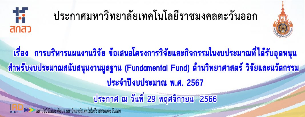 - ประกาศมหาวิทยาลัย เรื่อง การบริหารแผนงานวิจัยฯ (FF67) ประกาศ ณ วันที่ 29 พฤศจิกายน 2566